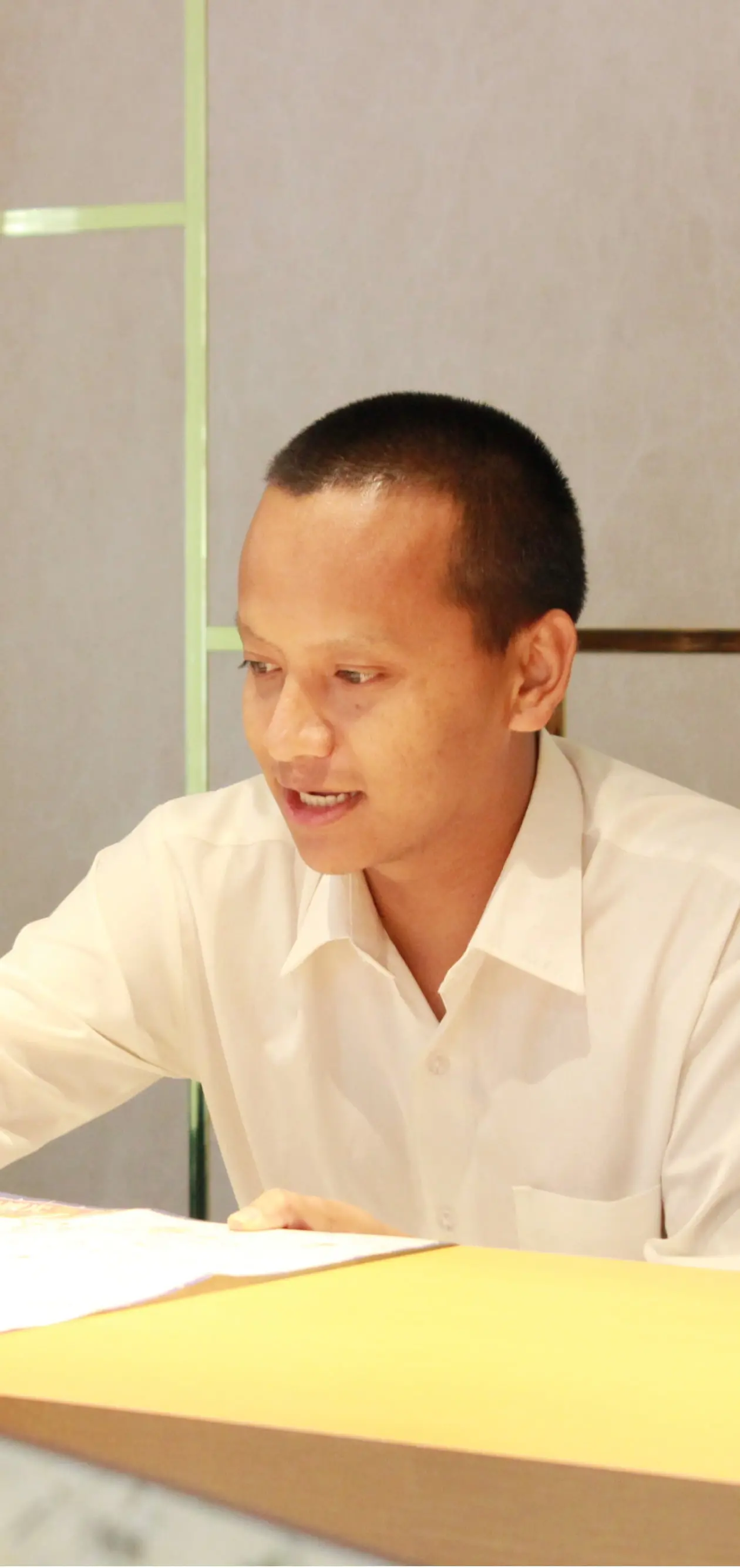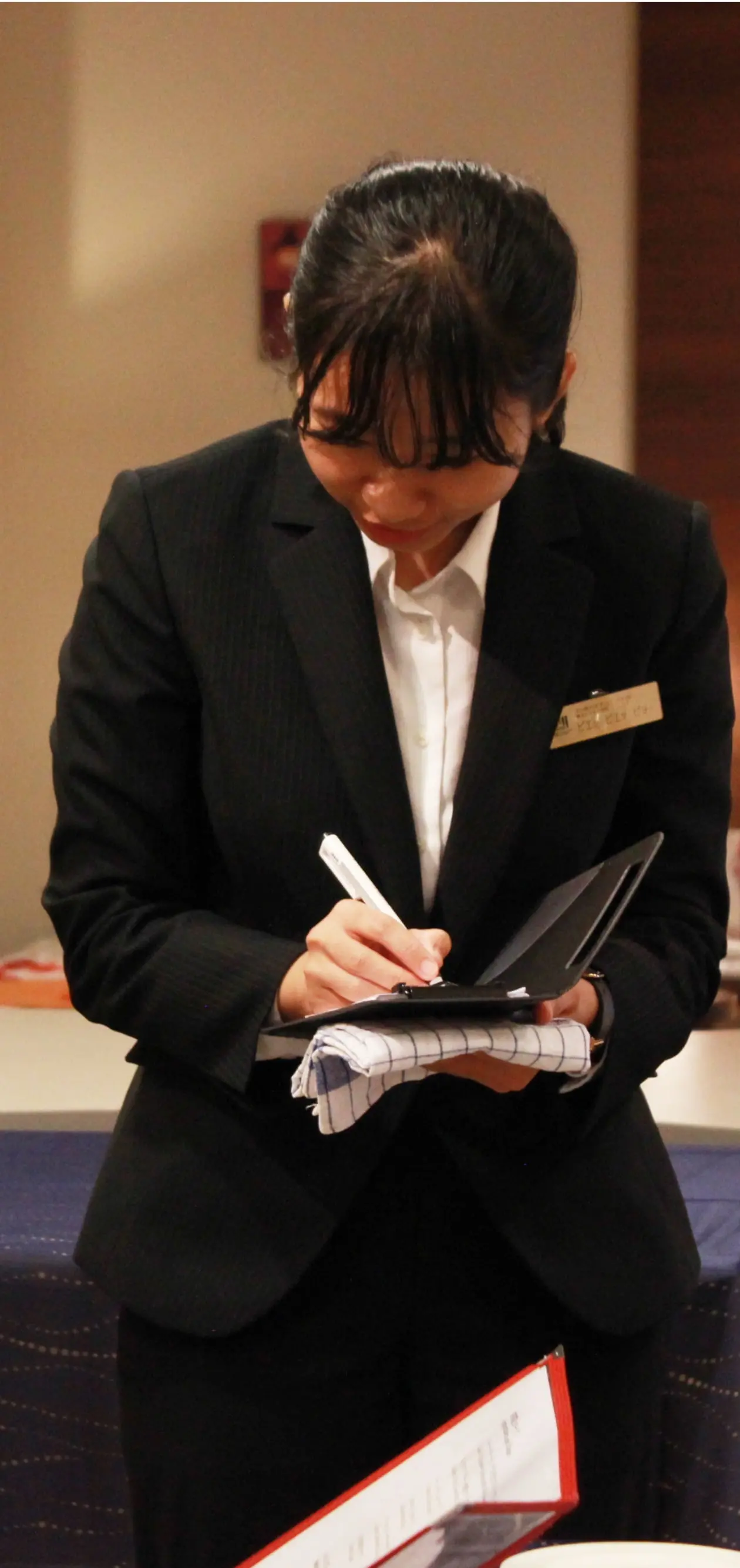 客様きゃくさま大切たいせつなお食事しょくじのひとときを演出えんしゅつする、サービスマンです。日本にほんのおもてなしのこころでサービスをします。